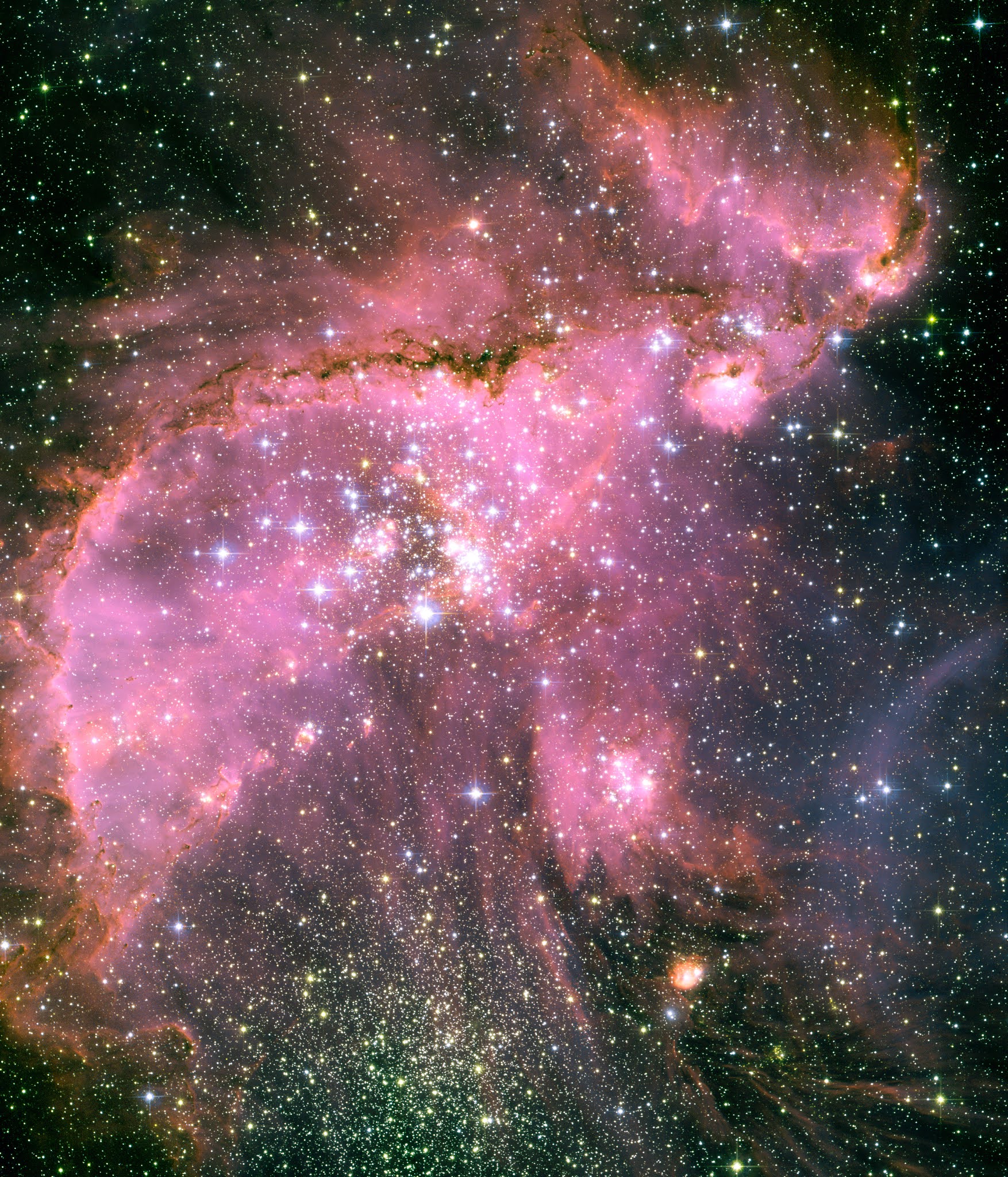 This new image of the Antennae Galaxies shows obvious signs of chaos. Clouds of gas are seen in bright pink and red, surrounding the bright flashes of blue star-forming regions — some of which are partially obscured by dark patches of dust. The rate of star formation is so high that the Antennae Galaxies are said to be in a state of starburst, a period in which all of the gas within the galaxies is being used to form stars. This cannot last forever and neither can the separate galaxies; eventually the nuclei will coalesce, and the galaxies will begin their retirement together as one large elliptical galaxy.
